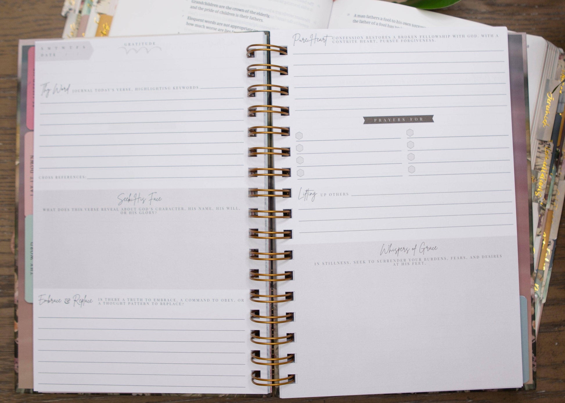 Within this prayer journal, you will find FOUR TABBED sections: Be Lifted Up, Lay It Down, Thy Word, and Sermons & Notes.