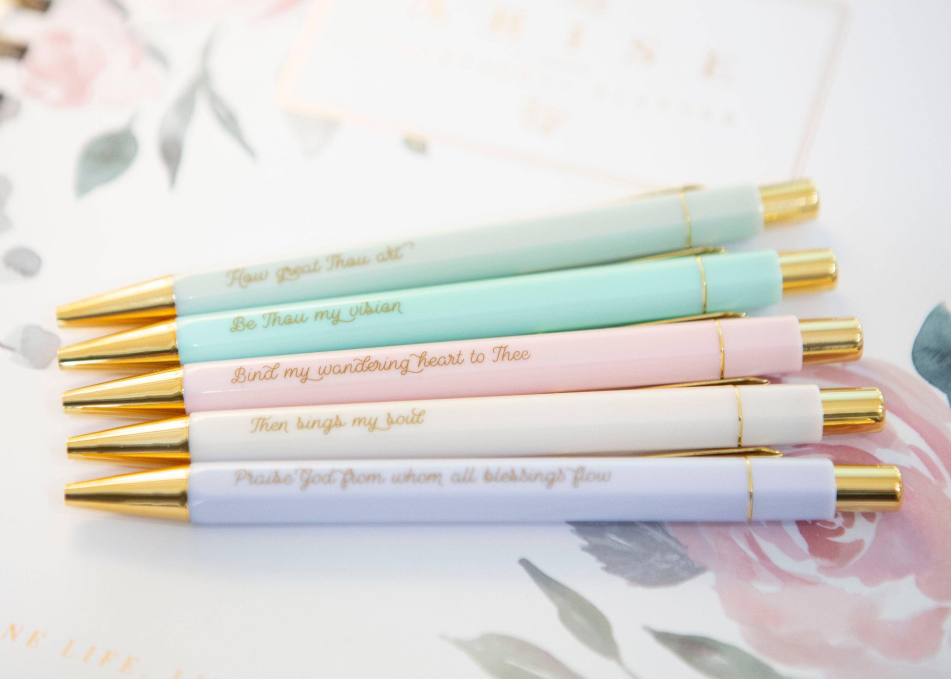 Inspired by all-time favorite hymns, this Christian Hymn Pen Set includes: Then Sings My Soul, How Great Thou Art, Bind My Wandering Heart to Thee, Praise God From Whom All Blessings Flow, Be Thou My Vision.