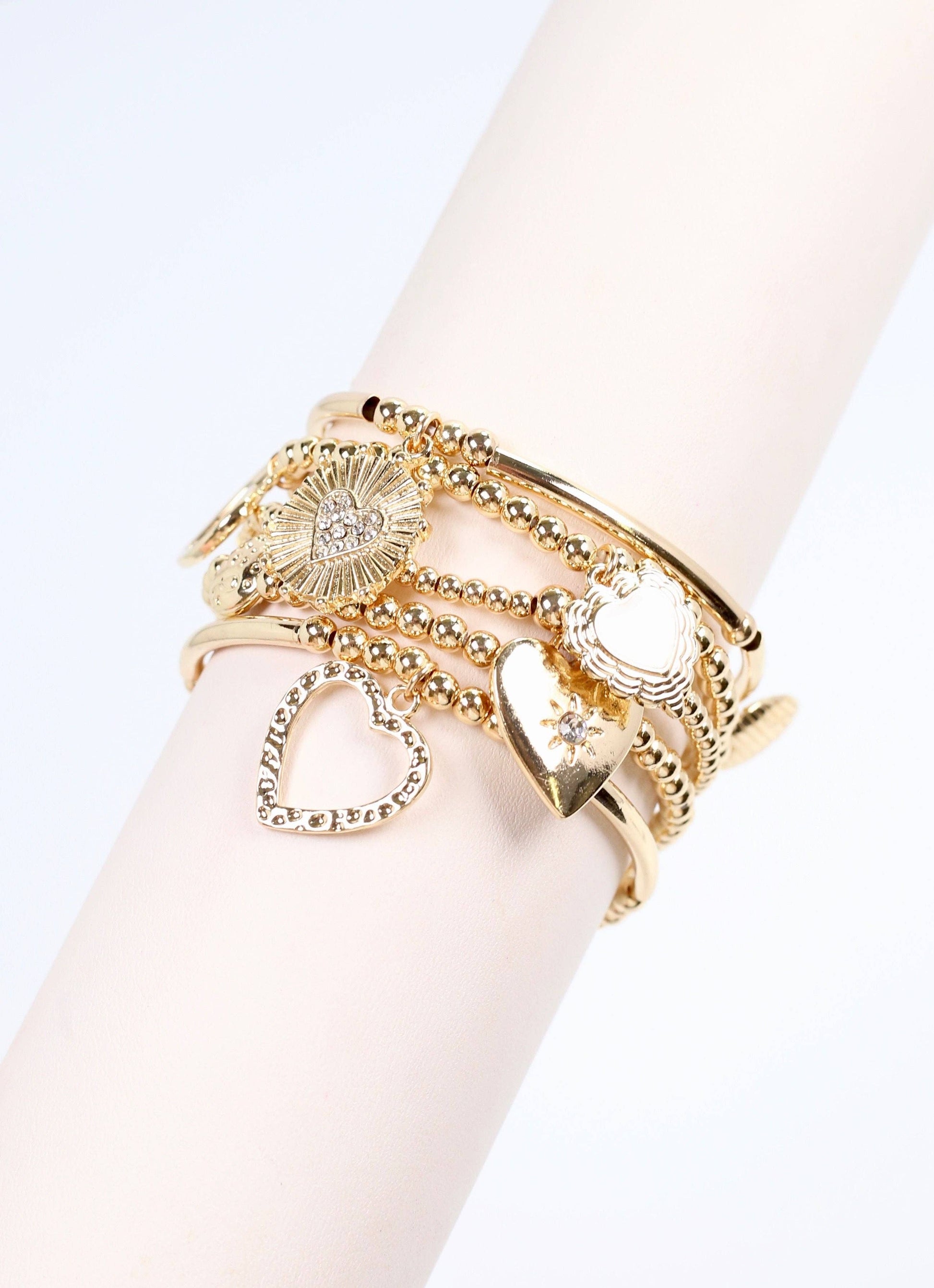 This heart charm bracelet set is lined with two types of beading for a dimensional design. Each strand has unique charm accents for a lovely variety. Stretches to fit most wrists.