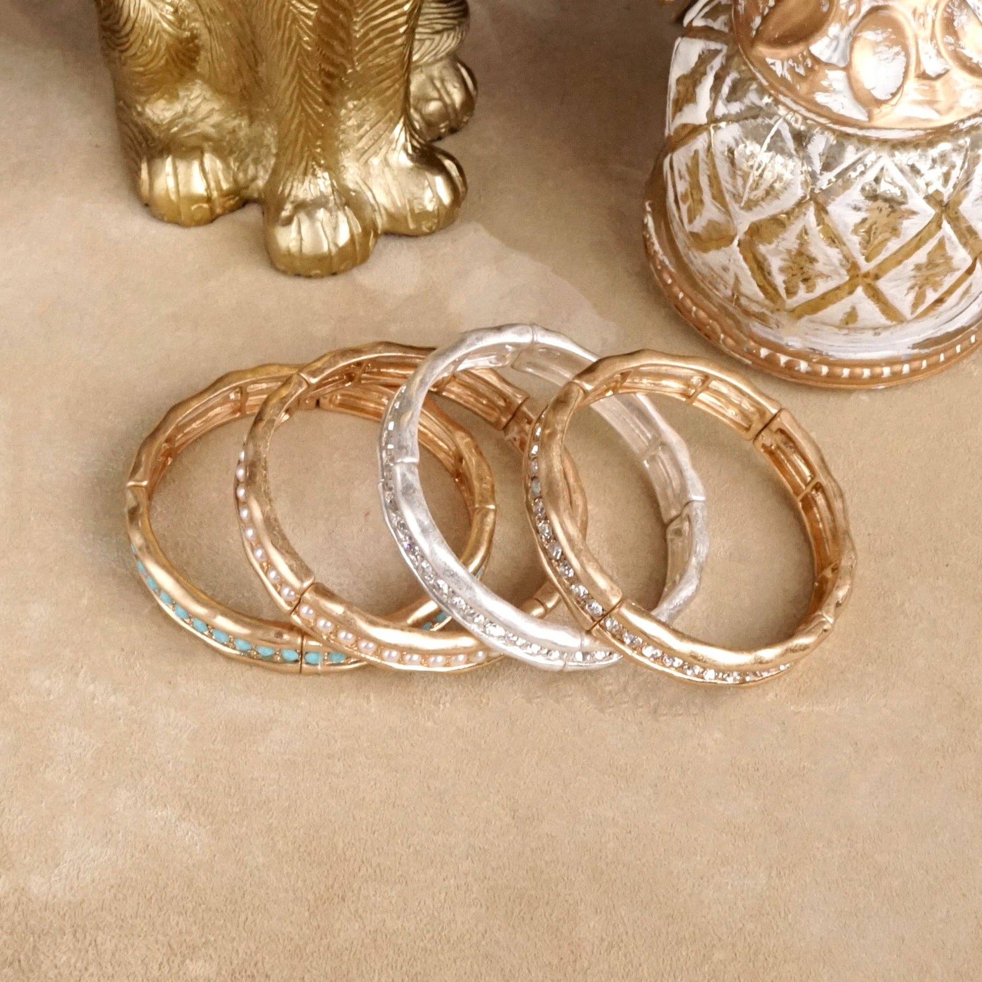 Delicate with a quiet sparkle, this 0.3" bangle features a brushed metallic finish and a touch of shimmer in crystal, pearl, or turquoise-style accents. An easy, stretchy fit makes it perfect for layering or wearing solo.