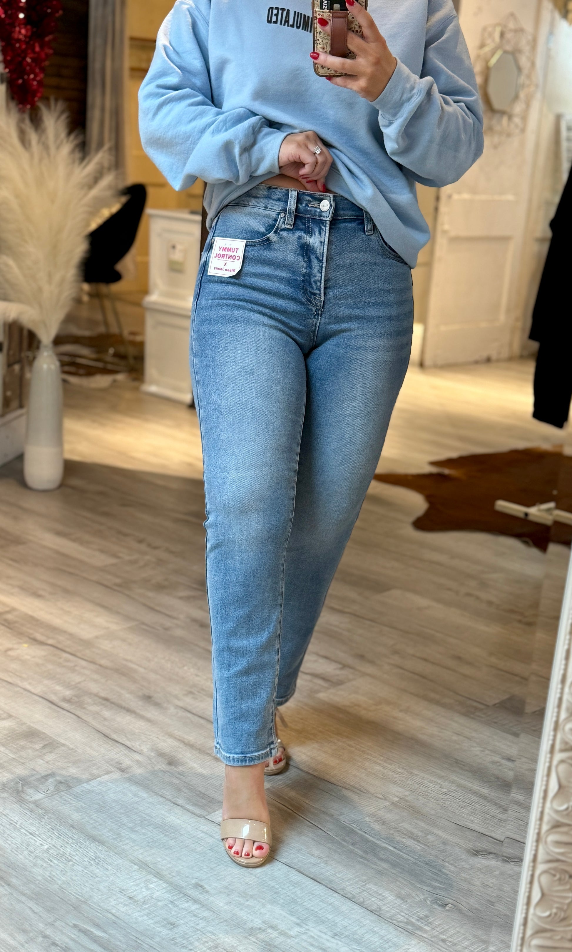 Medium Wash • High Rise • Tummy Control • Extra Comfort Waist • Straight leg • 27” Inseam • 10 3/4” Rise